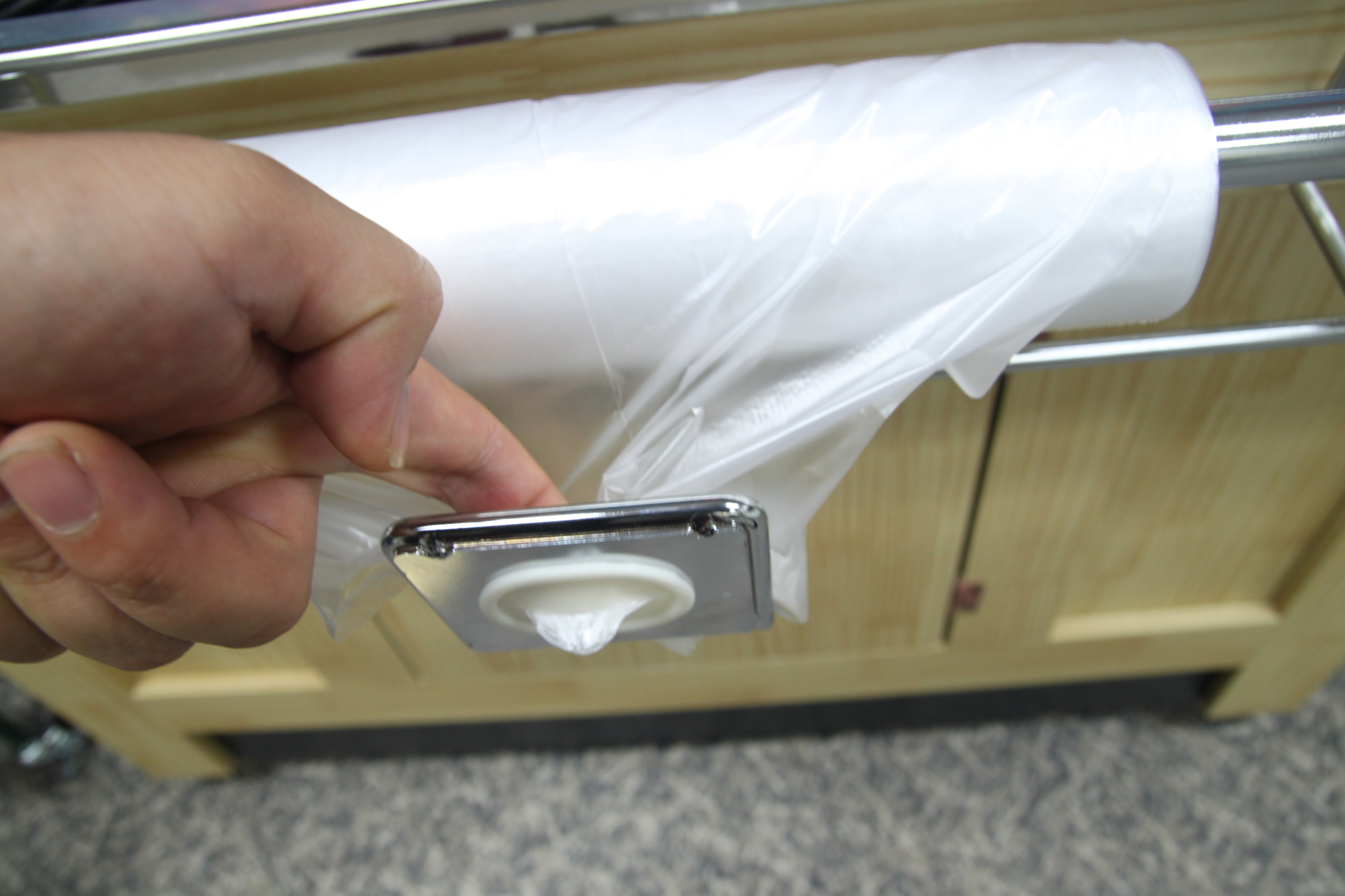 위 사진은 국내대형매장에서 사용하는 롤봉투걸이대 컷팅기 입니다.