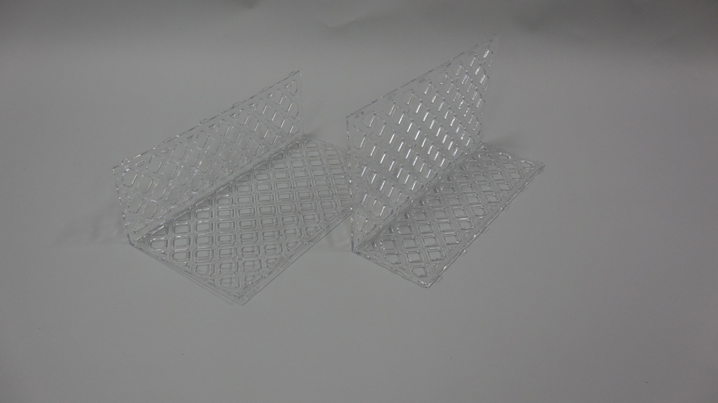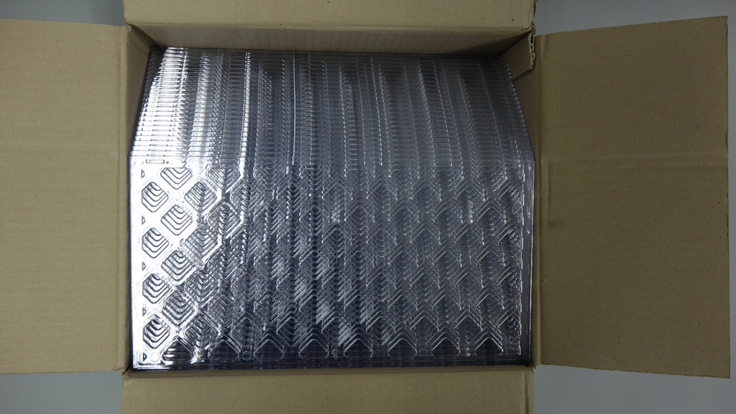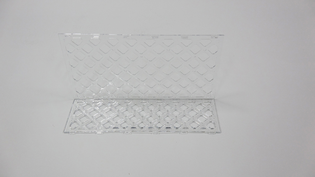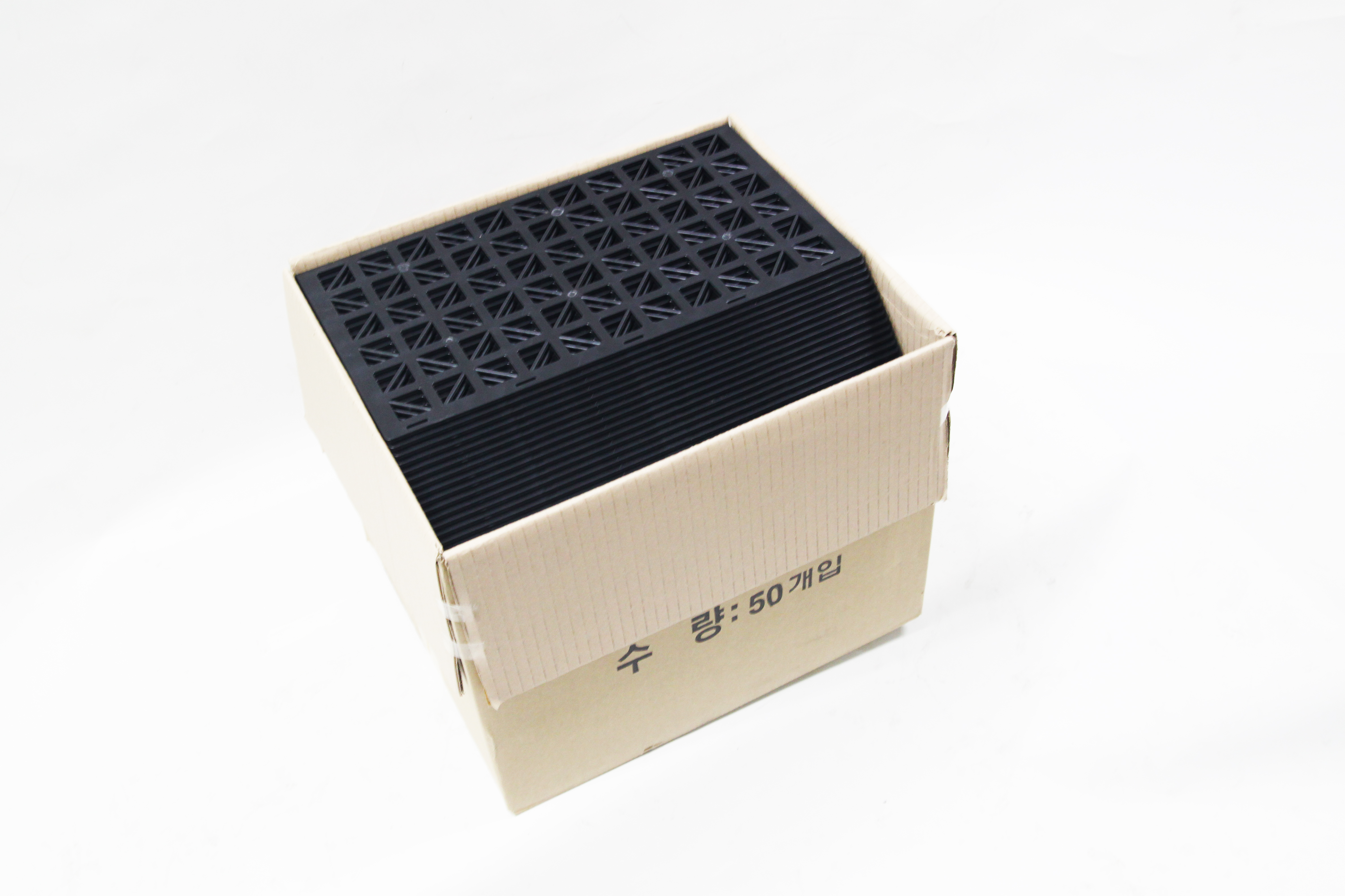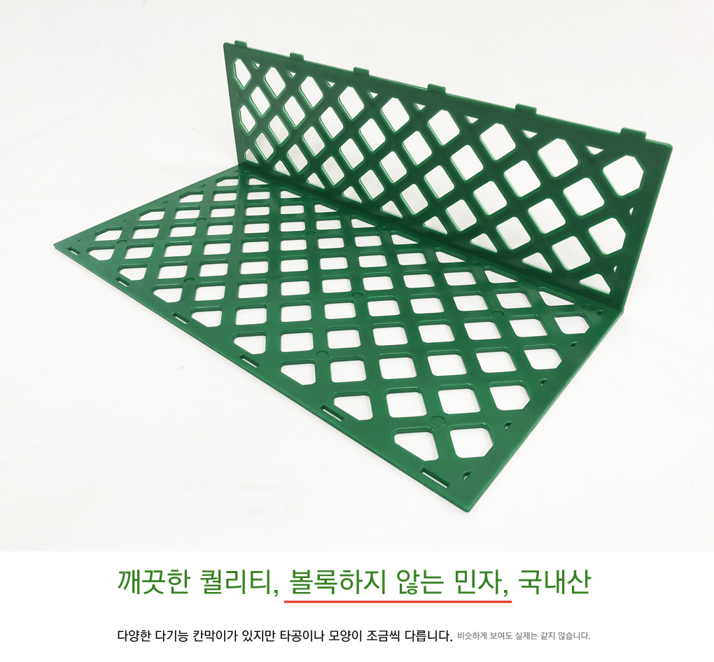 칸 사이에 사선 1줄이 더 들어가 있는 것을 보실 수 있습니다. 약간의 무게감이 있고(물론 큰차이는 아닙니다) 1줄 사선으로 약간 촘촘해 지는 특징이 있습니다. 이는 고추같은 얇거나 작은 상품들 구분과 진열하실 때 타공 밖으로 이탈 하는 것을 어느정도 방지 하실 수 있습니다. 하여 적용시고자 하는 코너에 맞게 선택 해 주시면 됩니다.